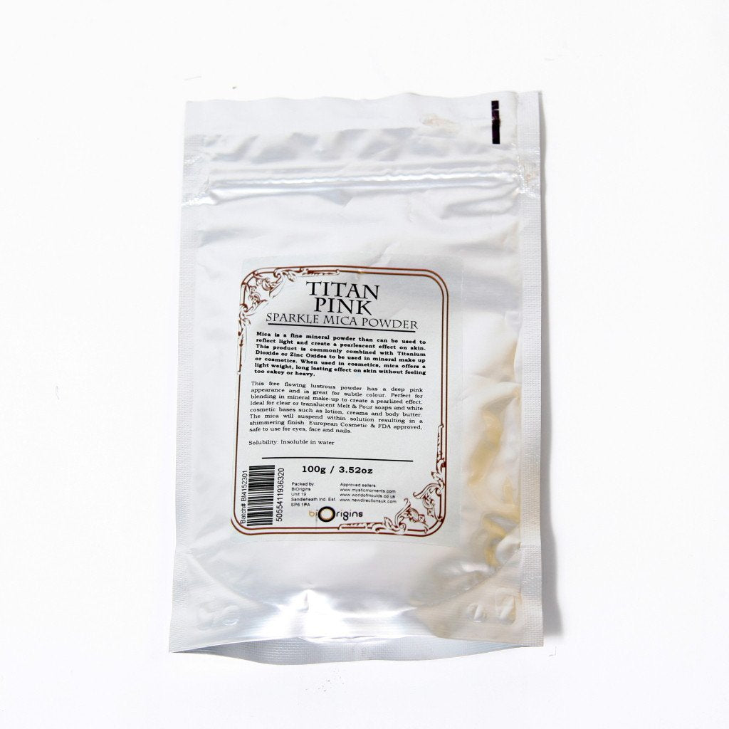 Titan Pink Sparkle Mica is composed of mica flakes coated with rutile titanium dioxide, which appear glossy and sparkling silver in colour. The light absorbing material is then directly deposited to form the pigment. When mixed with transparent pigment or dyestuff the pigment colours and the lustre shine through beautifully.